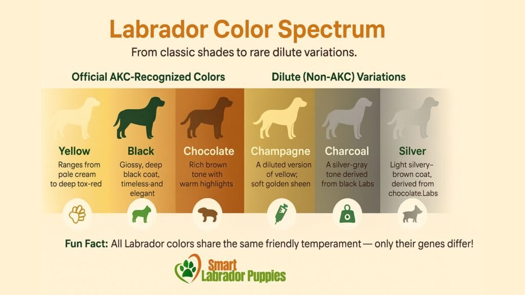 Key Distinction: Official AKC colors (Black, Yellow, Chocolate) vs. Unofficial/Dilute colors (Silver, Charcoal, Champagne) which are registered under their closest standard color but have distinct genetic origins.